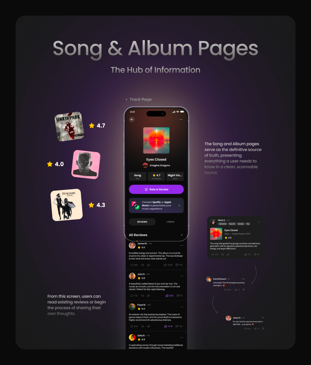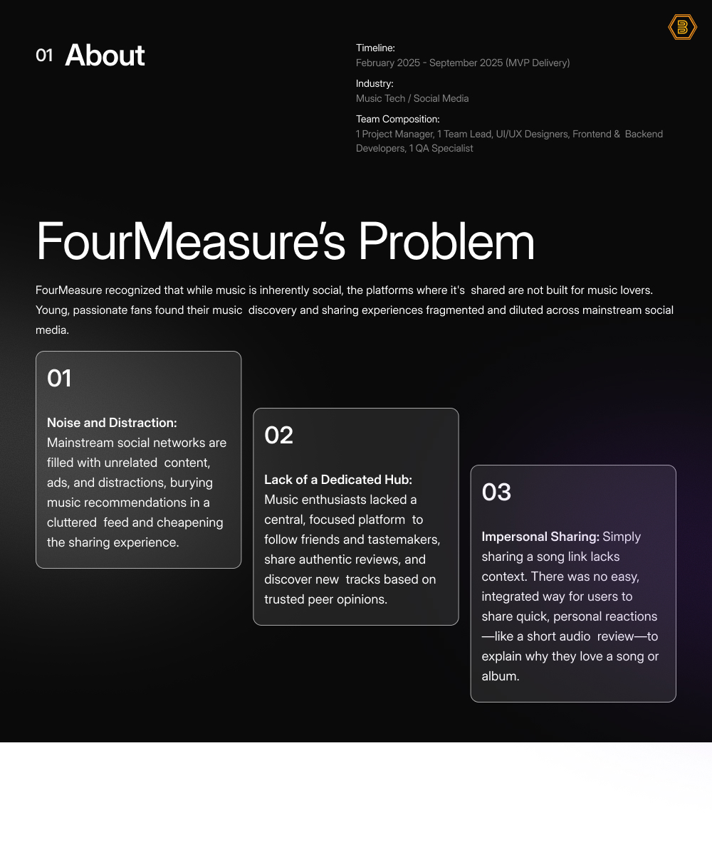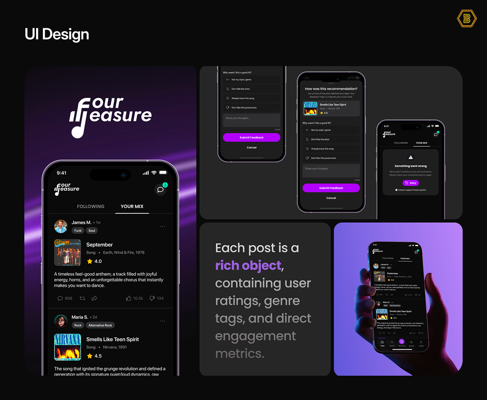 Mainstream social media dilutes the music discovery experience for passionate fans. FourMeasure envisioned a dedicated hub for authentic sharing and peer recommendations, free from clutter.