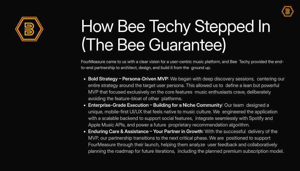 Bee Techy partnered with FourMeasure, using a persona-driven Bold Strategy to define a lean MVP focused on core user needs like audio reviews and trusted discovery.