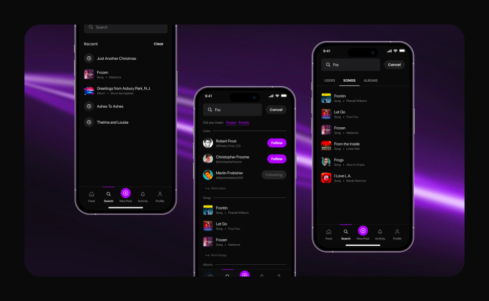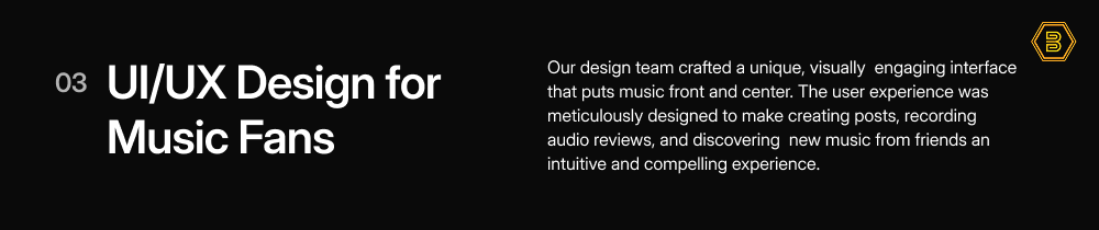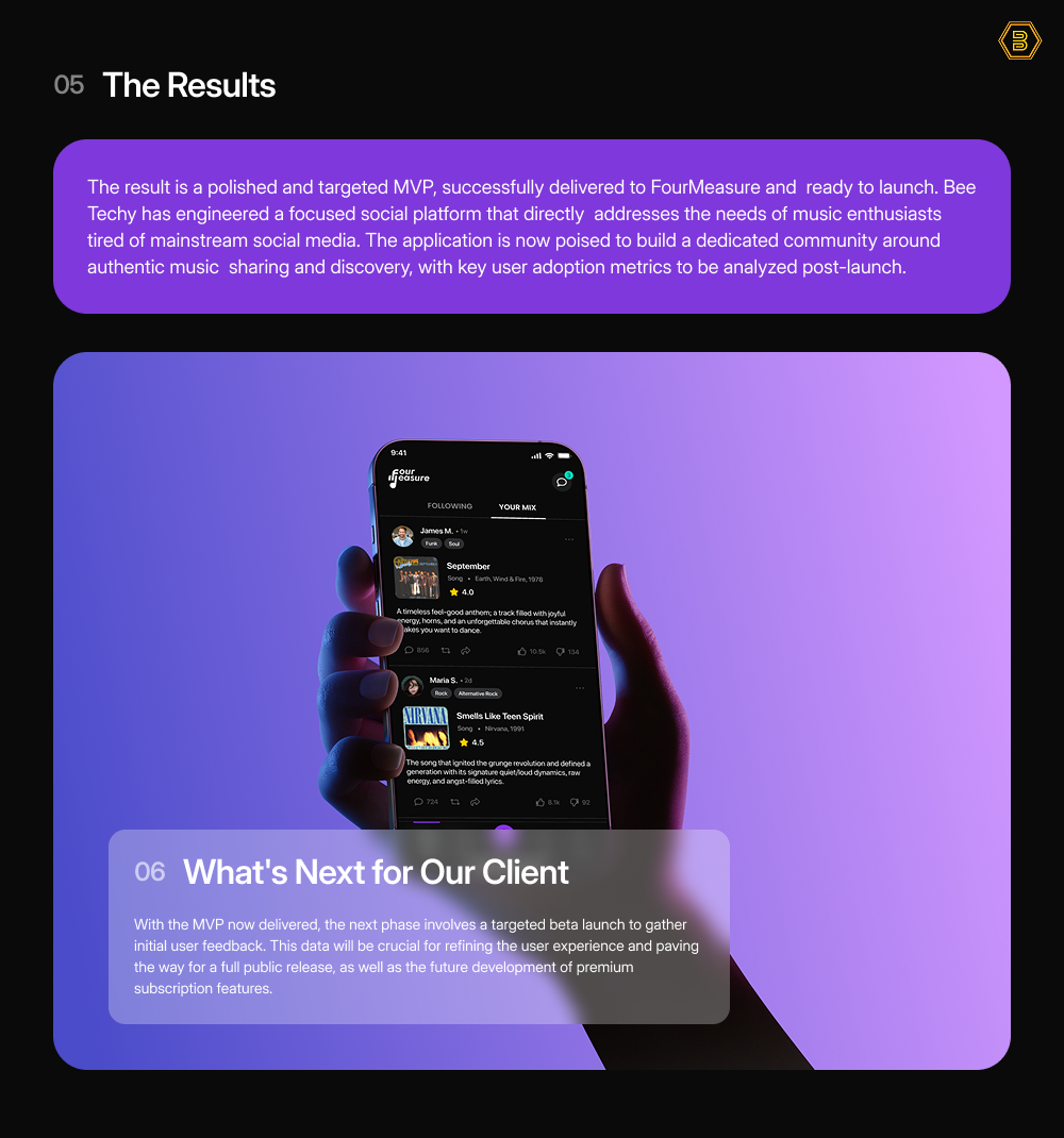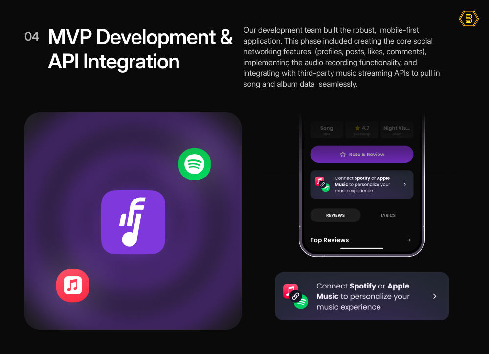 Our Enterprise-Grade Execution delivered a unique, mobile-first UI/UX native to music culture, built with a scalable backend and seamless Spotify/Apple Music API integration.