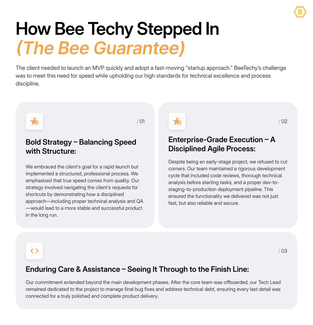 They required a technical partner to “balance the need for speed” with high standards for excellence. Bee Techy stepped in to architect a solution that ensures accuracy, security, and scalability for complex business evaluations.