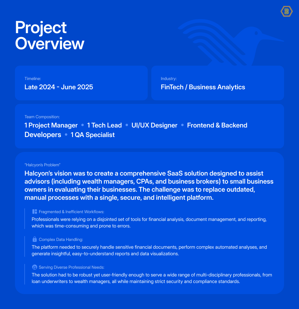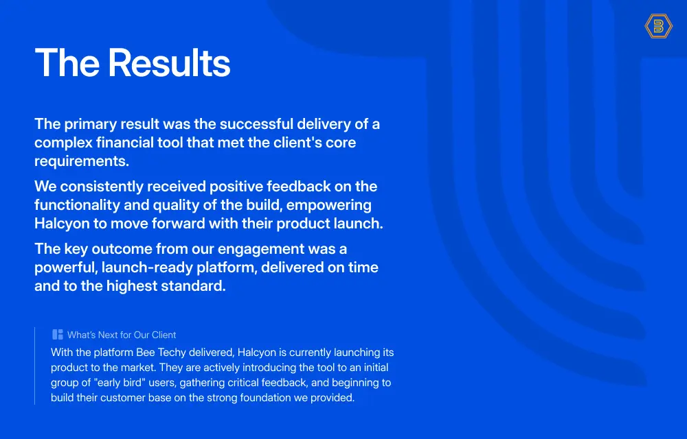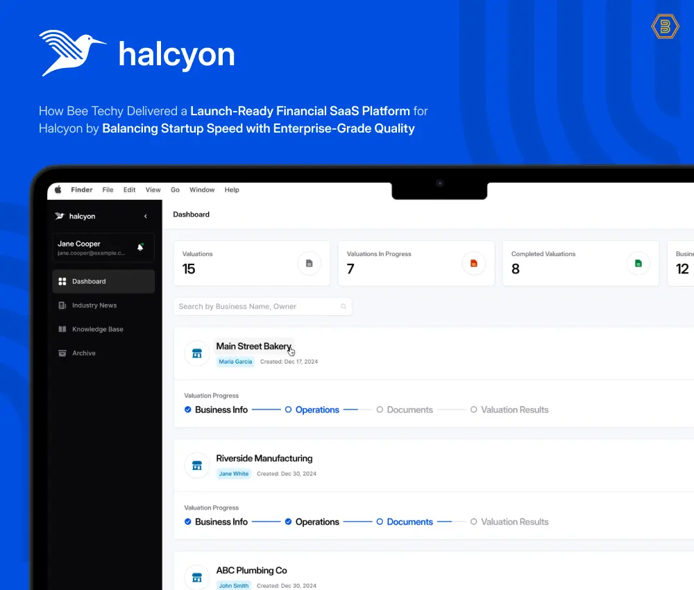 This Halcyon Financial SaaS Case Study details how Bee Techy partnered with a FinTech startup to build a launch-ready, enterprise-grade platform.