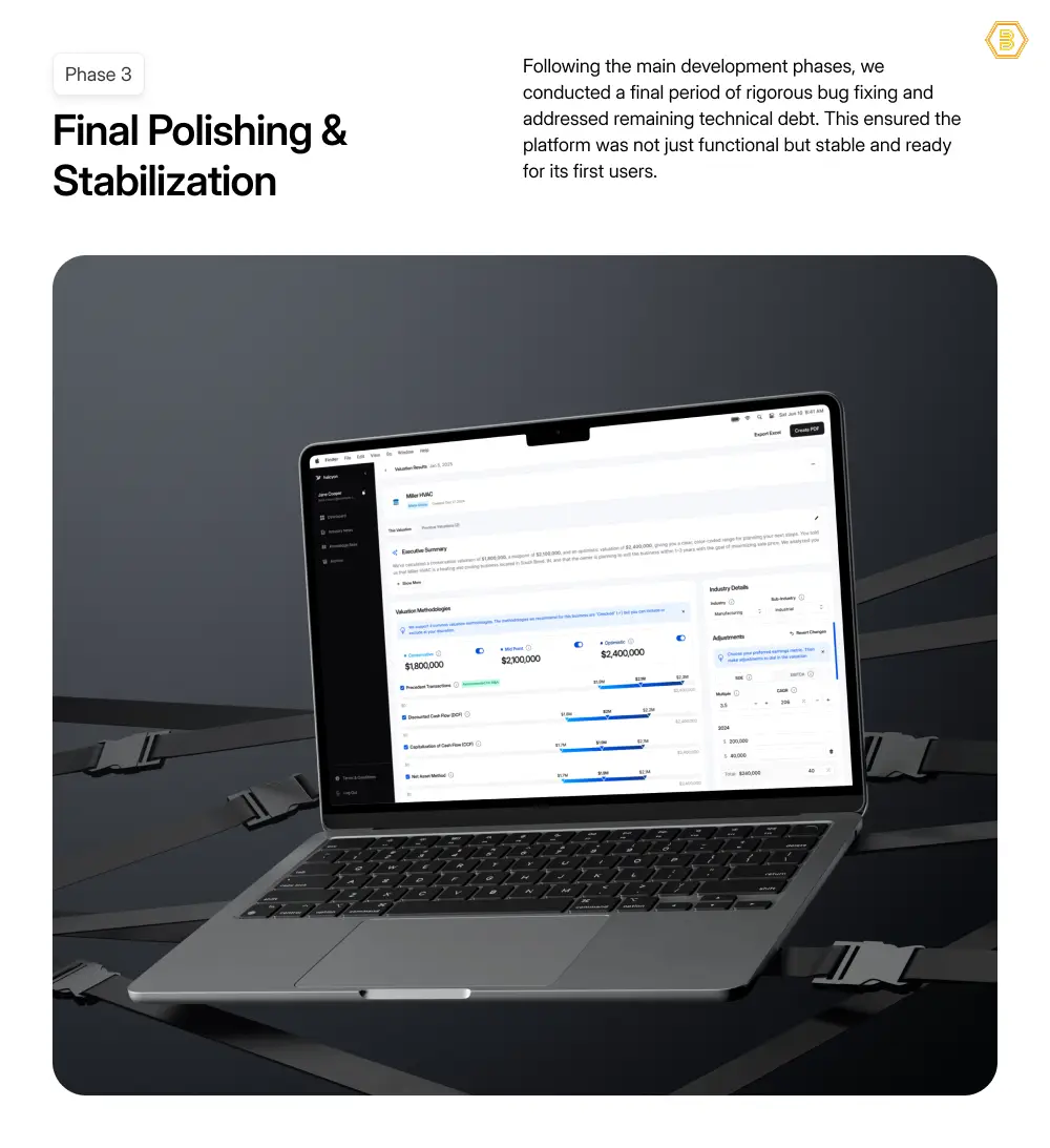 We utilized a “Disciplined Agile Process”. Phase 1 focused on “Building the Core Functionality”, setting up the infrastructure and essential user flows . Phase 2 was dedicated to “Enhancing Accuracy & Depth”, specifically improving the “accuracy and depth of the financial calculations” . Phase 3 involved “Final Polishing & Stabilization”, conducting rigorous bug fixing to address technical debt .