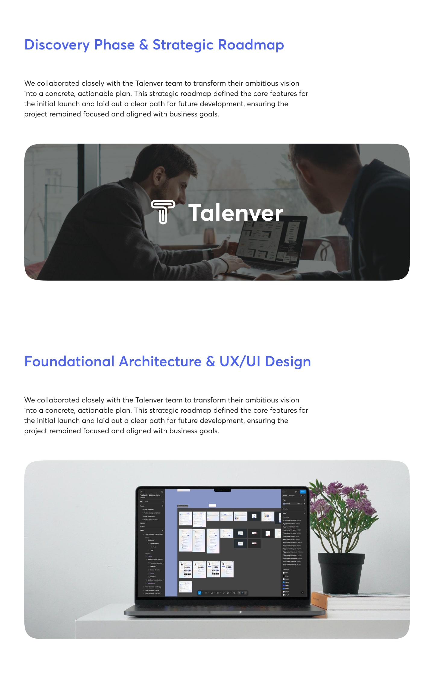 Our strategy began with “Bold Strategy – Deconstructing the Super-App”. Our approach involved a comprehensive “Discovery Phase & Strategic Roadmap” to break down the multi-service platform into a “manageable, phased roadmap”. We collaborated closely with the Talenver team to define core features, ensuring the project remained focused on a clear path for launch and future development.