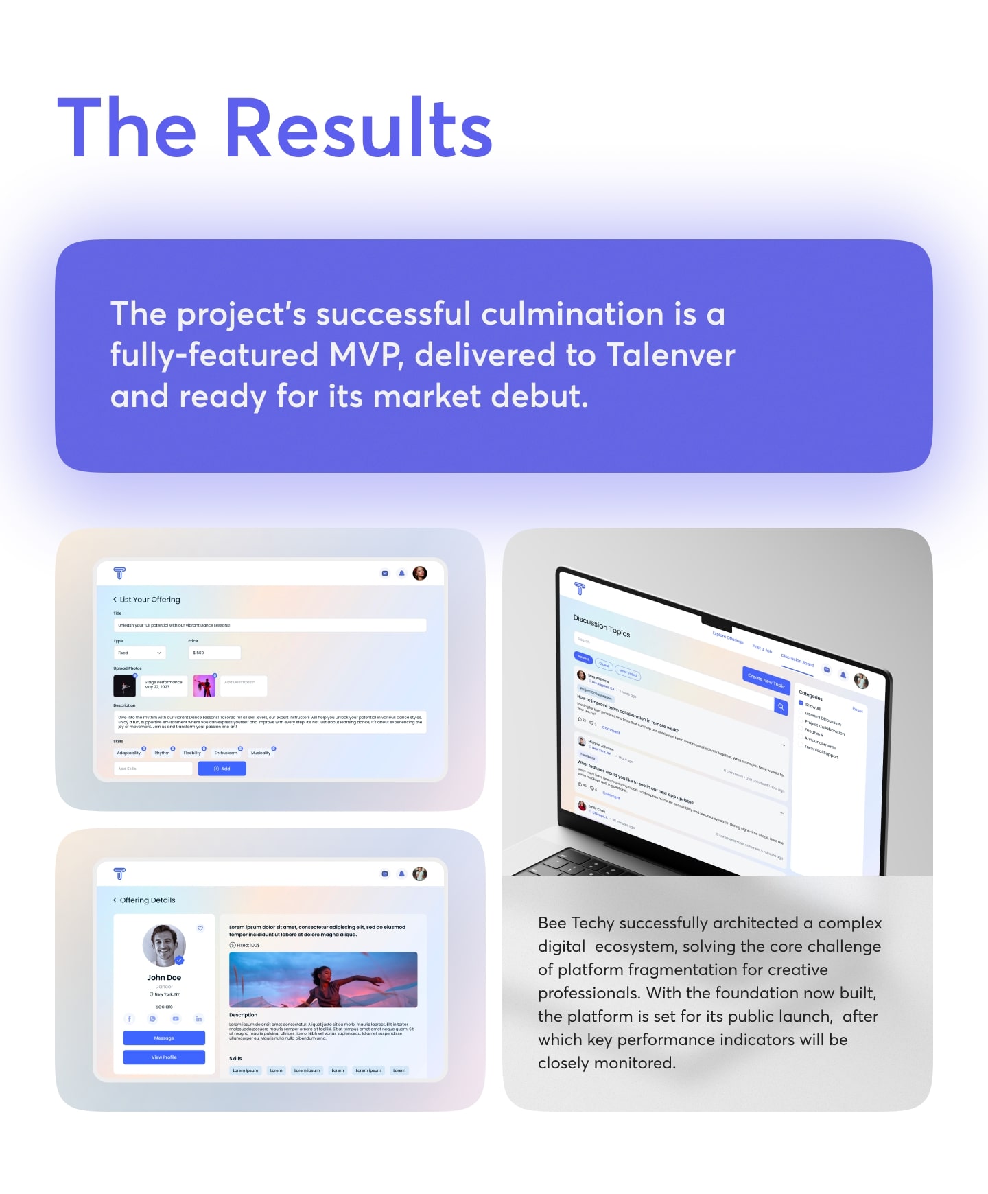 The project’s successful culmination was a “fully-featured MVP, delivered to Talenver and ready for its market debut”. As part of our “Enduring Care” partnership, our focus is on supporting their launch. The future “roadmap includes building out a dynamic discussion board” , “Implementing the full marketplace functionality” , and “developing the native mobile app”